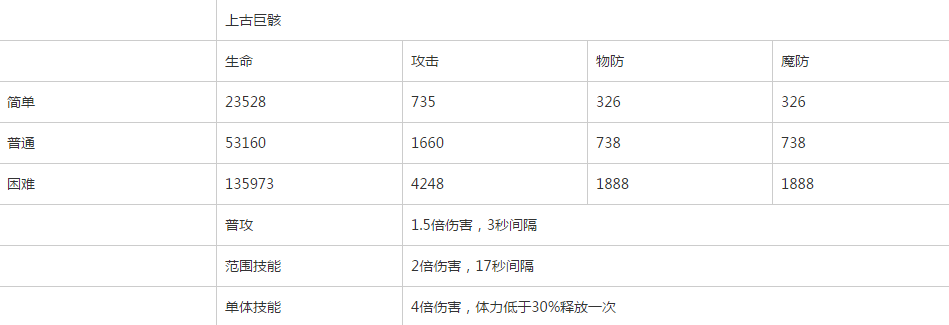 上古巨骸是狩魔BOSS之一,这BOSS需要注意的是当打到体力低于30%的时候就会释放一次4倍伤害的T单体攻击技能,还有个群攻是一把刀向下砍,所以这里的话队长阿伦是基本没什么用了,打这BOSS最好多备几个奶妈,毕竟群攻还是挺疼的。