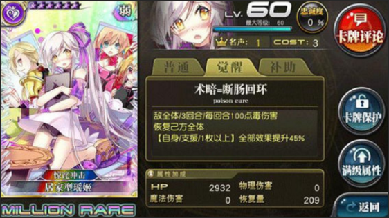真·毒奶,作用我只能理解为配合国服特色欧洲剑/欧洲妨。后面的特效比较谜,想要触发特效就必须到4C以后,这样配合打断的作用就几乎没有了。总之就是一张奇怪的卡,讲真你还不如指望丘豪上金发,反正停不住也是跳。抛开打断不谈,作为奶卡的素质就相当于个白板,而且没触发特效时的面板比白板还要低(推测)。就算敌全体需要上毒控制也一般是贼来,起手丢这张你就没有缓回没有回复量,除了拿来赌脸外我真的想不出有什么本能带上她了。