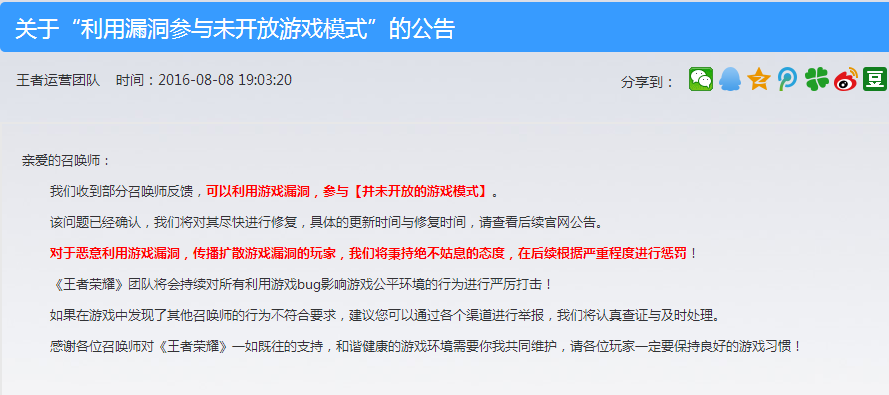 《王者荣耀》团队将会持续对所有利用游戏bug影响游戏公平环境的行为进行严厉打击!
