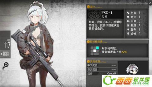 PSG-1可以说是一把比较中规中矩的RF了,其面板属性明显低于5星RF,但依然属于比较强力的行列,比较平均的攻击力和射速分配使得其适应能力还算不错,但是毕竟只是个4星,技能实在是太弱了.
