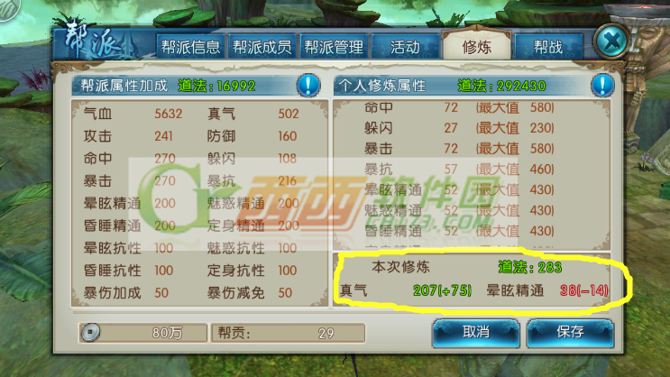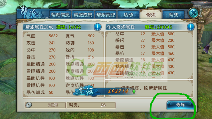 选择开始修炼,这个时候要查看你的帮贡,如果没有帮贡是无法修炼的。西西测试了一下6点帮贡修炼一次。