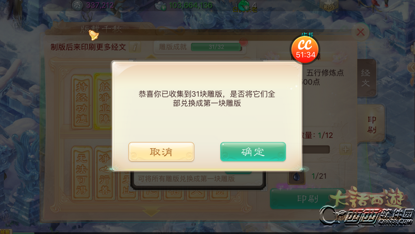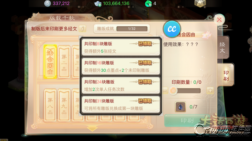 法会因由就是触发神秘任务这个经文,刻完第31块,第31块你可以先把笔画或上墨,但不要点确定!你可继续使用其他经文,做完12次单人任务,能赚取多些墨点。如果你12次单人都完了,你可以使用一本《净心行善》去杀boss,随机撤回少许已经开启的刻刀样式,并返还墨点,省墨点必用到,墨点不够的时候可以用上,这样做,便可省很多墨点来印刷或者使用其他经文。