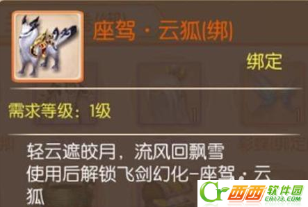 轻云遮皎月,流风回飘雪。座驾云狐使用后可增加玩家智力30点,力量30点,体质30点,是个十分不错的座驾。