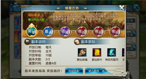 打开“活动-镇魔古洞”即可选择相应难度进入副本,可以选择自动匹配或直接小队进入副本。