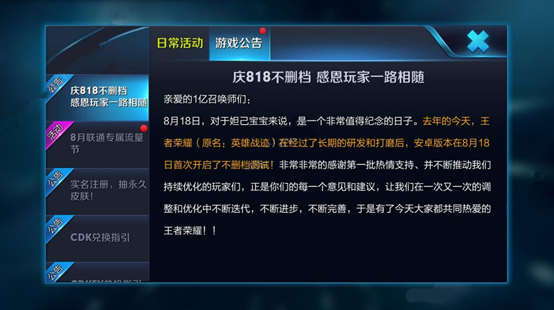 王者荣耀庆安卓818不删档活动来袭,王者荣耀818不删档活动全面一览。王者荣耀在今天开启了安卓818不删档活动,在去年的今日,王者荣耀安卓版开启了不删档的测试,为庆祝一周年,游戏为玩家准备了三大庆典活动,福利多多哟,今天西西小编就为大家带来王者荣耀818不删档活动全面一览。
