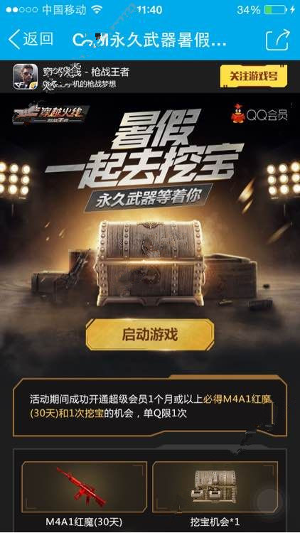 活动期间成功开通超级会员1个月或以上必得M4A1红魔(30天)和1次挖宝的机会,单Q限1次。