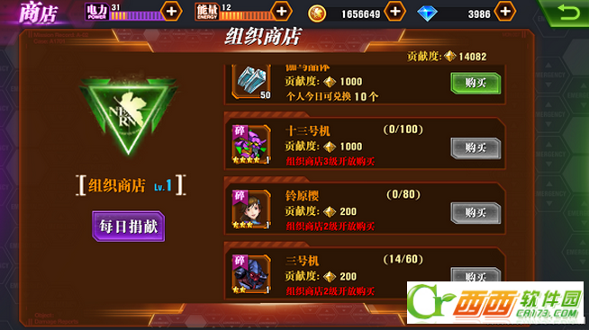 大家别忘了每天的组织捐献,推荐玩家进行中级以上捐献,能获得大量贡献度去组织商店里兑换资源。可以加个高等级组织,组织商店里的进阶晶体、同步药剂、伽马晶体都是必买的,而且组织商店还是十三号机和三号机碎片产出的重要途径。