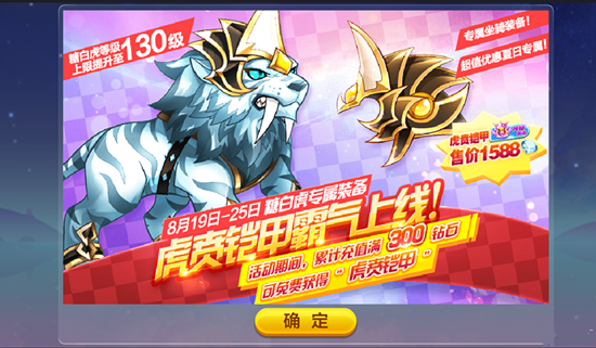 活动内容:活动期间,游戏内累计充值满300钻石,就可获得糖白虎坐骑配饰----虎贲铠甲*1