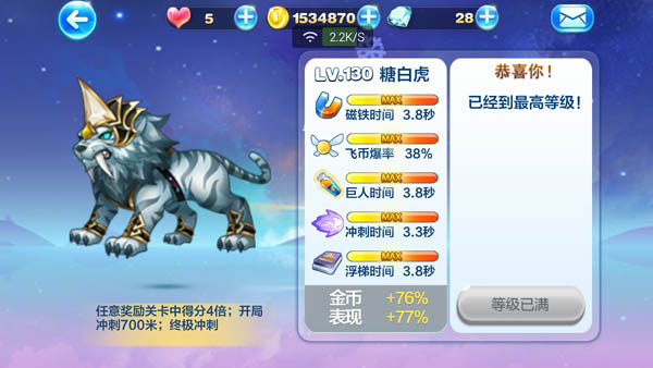 任意奖励关卡中得分4倍;开局冲刺700米;终极冲刺。
