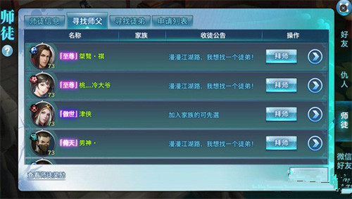 根据VIP等级的不同,师徒系统允许等级相差2-5级以上的少侠成为师徒。按照剑侠江湖的拜师规矩,每个徒弟最多只能拜入两位师父的门下学习。