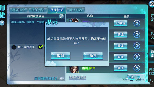 当然,如果你对目前的师父或者徒弟不满意也可以单方面解除师徒关系,寻找真正的良师高徒,解除师徒关系需要至少24小时的确认时间。要满24小时之后的下一个0点才能正式解除师徒关系。公测开启之后便会显示师徒头衔哦。