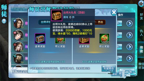 成为了徒弟不努力成长怎么行,师徒系统特地准备了“师徒目标”来激励徒弟快快成长。徒弟在完成若干个师徒目标后即可获取丰厚的奖励,将自己快速武装起来。而徒弟完成目标后还可以向师父进行汇报,两个师父均可以获得名望奖励。师父在获取名望后,可以通过“名望商店”购买五香粽、八宝粽、武林秘籍、外装、随机4级同伴技能书等稀有道具。所以师父一定不能将徒弟放养,千万要记得敦促徒弟完成师徒目标。