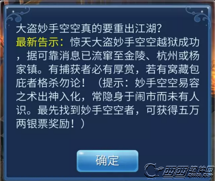 2. 出逃后,他会随机出现在一张地图,且每隔一小时会更换场景;并易容为一个随机角色,隐身于闹市;(最先找到妙手空空者,可获得五万银票奖励)
