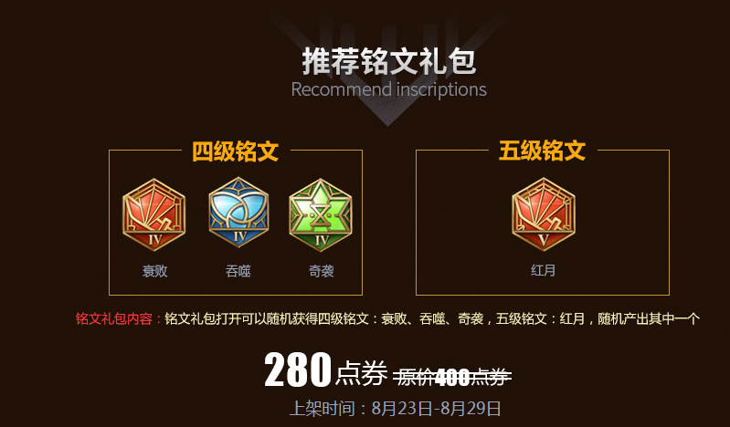 马可波罗铭文礼包:首周折扣除了马可波罗英雄皮肤以外,还有配对的符文,打开可以获得随机的符文衰败、吞噬、奇袭和红月,其中红月是五级符文。
