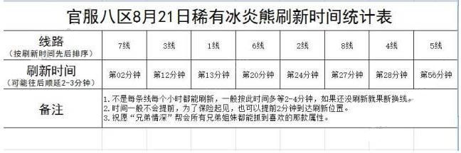 上述的表中可以看到,各线的刷新时间是不一样的,同时也不是总共的刷新时间,而是间隔时间,小伙伴能从7线开始尝试,一旦刷新了,那么下一次刷新就会在12分钟之后的3线刷新,以此类推,就能抓到很多冰焰熊了!
