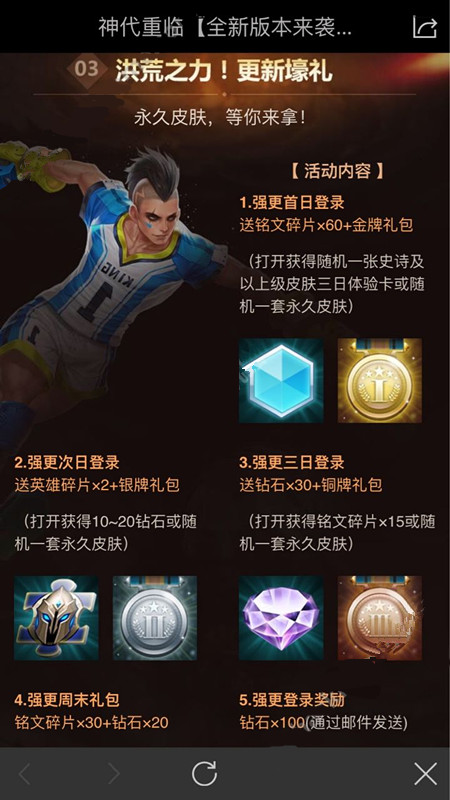 3.强更三日登陆,送钻石30,铜牌礼包。打开获得铭文碎片15,或随机永久皮肤。