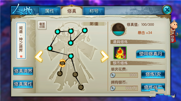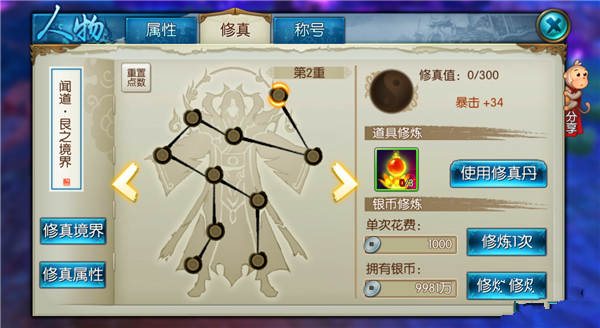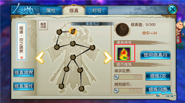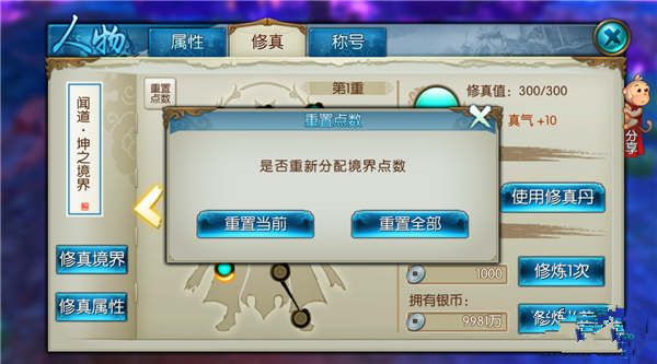 如果大家要对修真的加点进行修改,可以点击重置点数。可选择重置当前重数或所有重数。