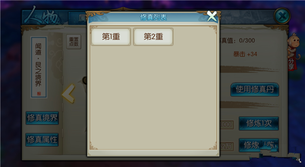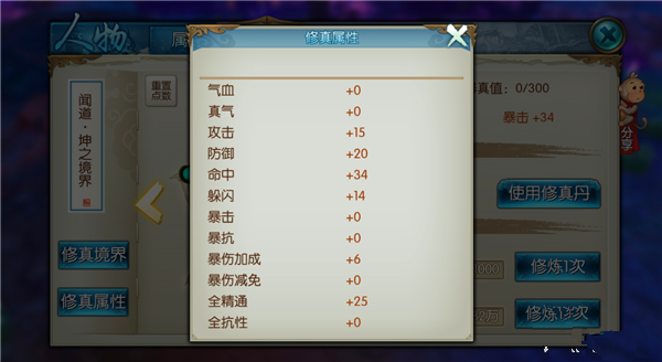 大家可点击左侧按钮查看已完成的修真境界和已加成的修真属性。