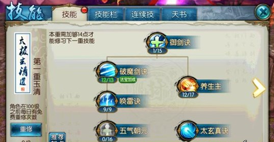天书:第一卷天书都很重要,优先加满右侧然后再点满左侧,请务必点满第一卷天书!第二卷则更偏向PVP,初期实用度不高,第三卷和第四卷由于玩家等级还未达到暂不讨论。