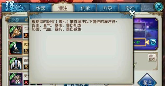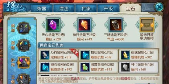 宝石由于目前只开了三个孔,基本上和灌注无异,戒指、项链插攻击类宝石,护符、玉佩则插防御类宝石。