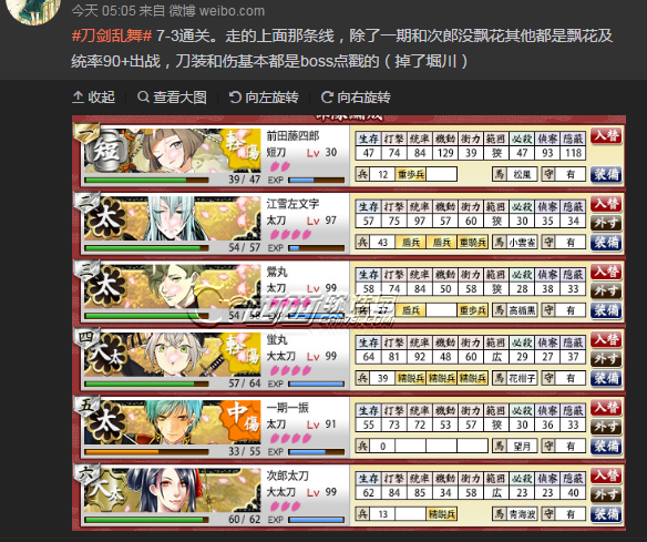 5)这图马依旧无效,机动慢的(大太,枪,太刀)可能跑不过对面的三花枪(是的,你没看错,是三——花——枪!)顺便我上面发的队伍成员除了极短全是99级。