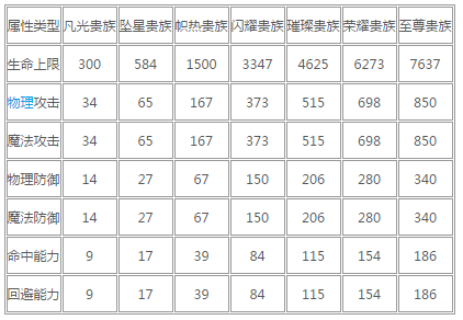 贵族特权属性加成一览表: