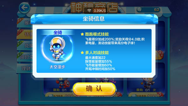 太空漫步——天天酷跑新版本克隆版爆出的新萌装坐骑,从目前的技能来看,太空漫步这款新坐骑的实力应该还算可以,高分电子球可以为玩家带来的加分还不错,但和小丑库卡的高分奶瓶相比估计占不到什么优势。