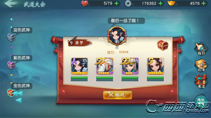 武道大会最开始蓝色难度,打赢3把可以选择升紫色,再打赢3打可升橙色。