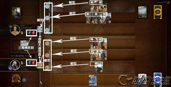 3.单位卡分为3类,近战,远程和攻城。每类占一横排。一小局游戏结束时,全部攻击力量值相加,大的一方获胜。