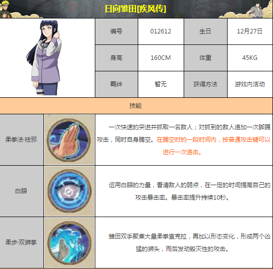 运用白眼的力量,看清敌人的弱点,在一定的时间提高自己的攻击暴击率。暴击率提升持续10秒。