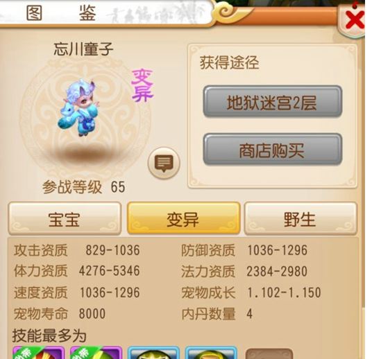 上面是低级内丹,如果是高级内丹的话,建议催心浪或者双星爆,忘川童子是69级宠物阶段法术资质最高的,不利用好就可惜了,这两个高级内丹都可以一定程度上提高它的攻击能力。