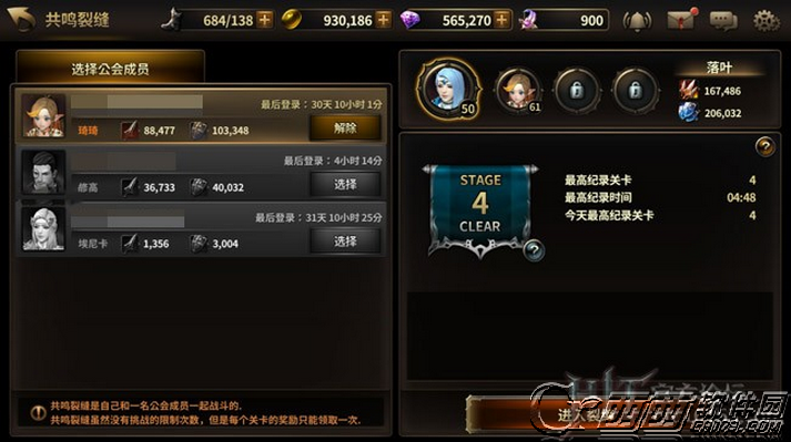 共鸣裂缝是选择一名工会成员和他一起进行闯关挑战,可以抱工会大神大腿一路趟赢哦。和内面裂缝一样同一时间只能有一个角色出战,同样可以通过点击角色头像切换出战角色和获得特有的入场效果。不过要注意的是,在本角色死亡后就意味挑战结束了,即便是工会队友还没死亡,他也只能帮你打完本关挑战,而不能继续进行下一关挑战,所以各位勇士要注意在本角色死亡前切换出工会队友进行战斗哦。