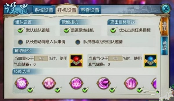 挂机设置中的【技能选择】就是自己所设置的主界面8个技能栏,如下所示: