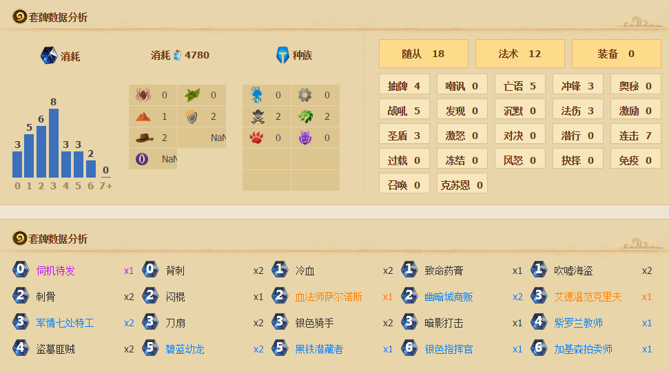于是我就开始考虑,究竟什么样的盗贼才能在这样的天梯生存下去?首先,卡组速度不能太慢,缺墙少奶多卖脸的职业特色让盗贼更适合偏快的节奏,所以法力曲线一定要低。其次,要尽量利用上强势职业单卡。