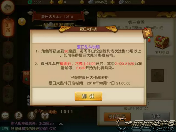 (2)当周华山胜利次数达到10场以上即可获得夏日大乱斗参赛资格,具体次数和说明可点击左上方提示栏。