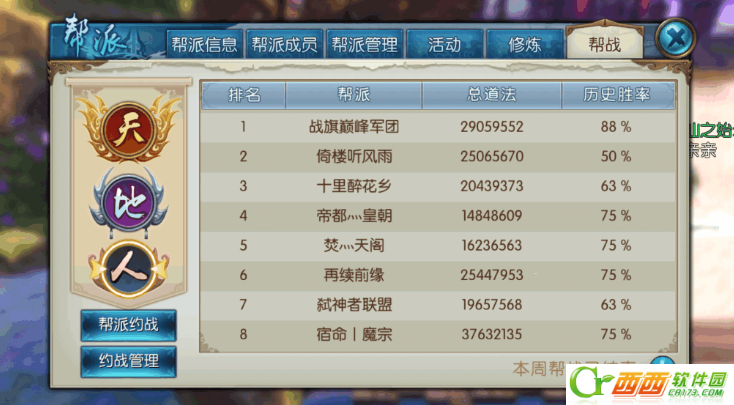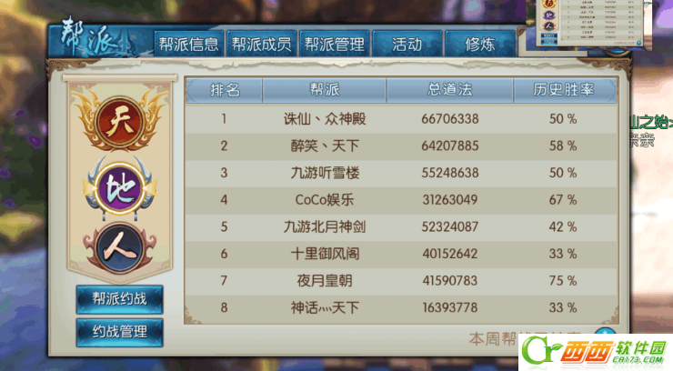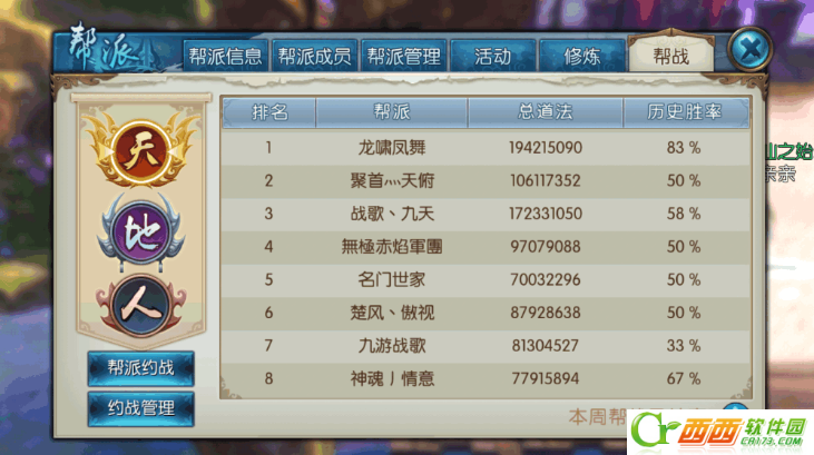 而帮战匹配则是根据帮派总道法、胜率、帮派等级等因素分成了天、地、人三榜