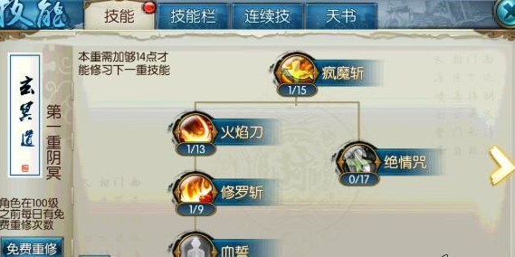 第一重:主加绝情咒、修罗斩和火焰刀;疯魔斩和血誓不推荐。