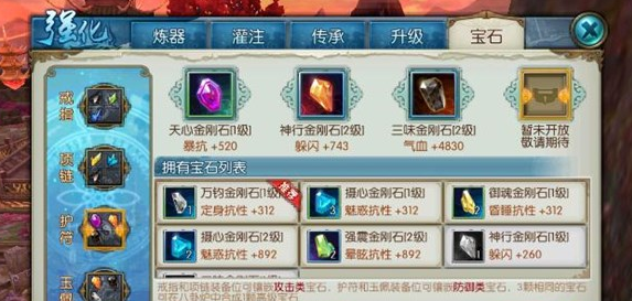 宝石由于目前只开了三个孔,基本上和灌注无异,戒指、项链插攻击类宝石,护符、玉佩则插防御类宝石。