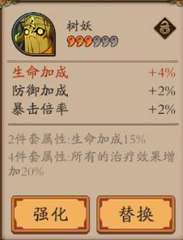 方案一:树妖4件套+攻击2件套。攻击力+15%,治疗效果+20%,技能治疗量为攻击的87%。即攻击力为1000*1.15=1150,基础治疗量为1150*0.87=1000.5,树妖套治疗效果叠加为1000.5*1.2=1200.