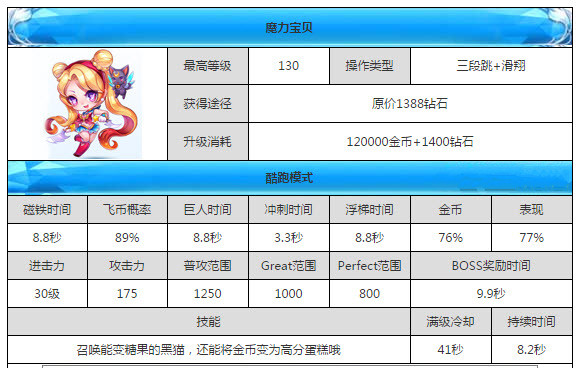 魔力宝贝的技能可以将金币变成高分蛋糕,黑猫也会喷出高分彩色棒棒糖,得分实力还是相当不错的。而且触发技能的时候,身后的小黑猫还会变大,飞到魔力宝贝前面,将所有障碍物都清除干净,虽然不是无敌的冲刺状态,但是保命能力也是相当不错的。。