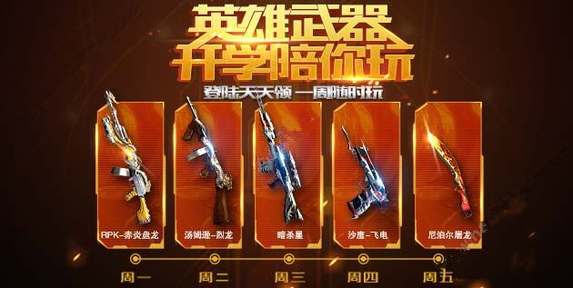 作为以回馈玩家为主旨的大型运营活动,本次“开学季,英雄武器狂欢周”规则极为简单,在9月5日至11日(周一至周五),玩家每登录一天游戏即可获得对应的“英雄武器体验卡”,其中周一至周五分别为玩家奉上RPK-赤炎盘龙、汤姆逊-烈龙、暗杀星、飞电、屠龙五大英雄武器,让你一次玩个够!