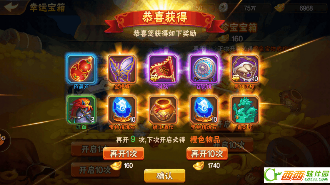 中级珍宝宝箱能开出橙色珍宝碎片和各种宝物,不建议用元宝开启。