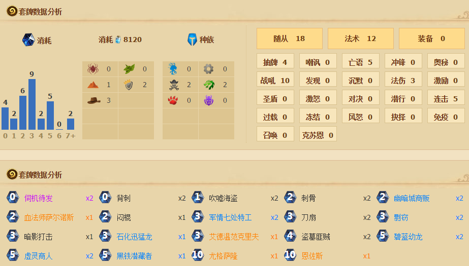 这套卡组结合了亡语贼和剽窃贼的思路,进可攻退可守,法力曲线较为平滑,尤格萨隆可以换成疾跑。