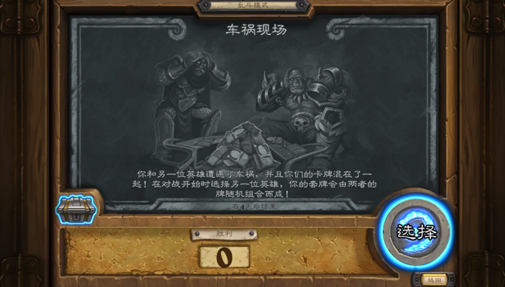 你和另一位英雄遭遇了车祸,并且你们的卡牌混在了一起!在本周乱斗模式中你可以选择一个职业,并在对战开始时选择另一个职业,你的套牌会由两者的牌随机组合而成!在变幻莫测的规则下谁能笑到最后?那就看谁的运气更好吧!