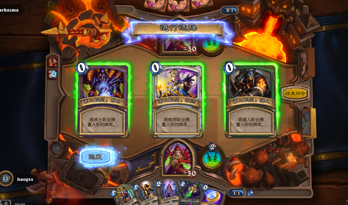 也就是系统随机预设套牌,双职业混合。选定英雄进游戏后,你的套牌里已有随机的20张,在你起手选择完第二职业后,再将10张该职业的卡牌洗入牌库。
