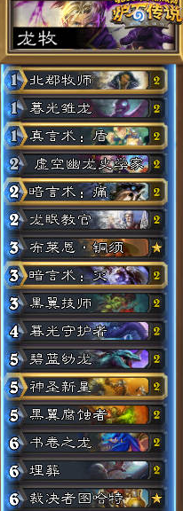 这套卡组对比以前的龙牧增加了两张虚空幽龙史学家,两张书卷之龙。除此之外,Vlps为了配合龙系套牌大量的战吼,还加了一布莱恩铜须,在对抗中后期卡组上,铜须+史学家的combo,可以补充上很多优质龙卡,毕竟很多龙都是传说卡的存在。