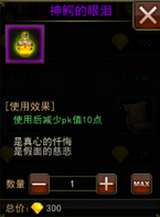 玩家变成红名后,PK值每小时减少1;玩家也可通过购买商城的道具“神鳄的眼泪”来清除PK值,每一滴眼泪可使PK值减少10。