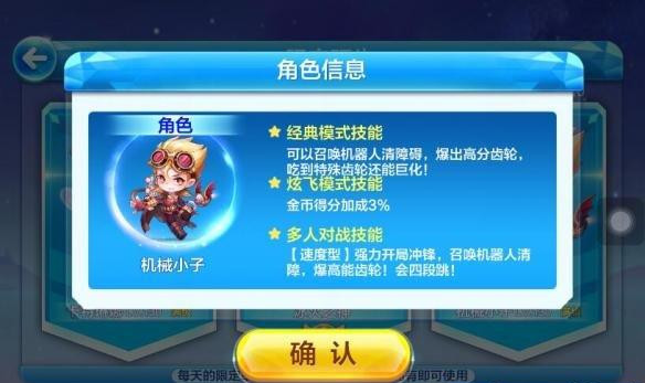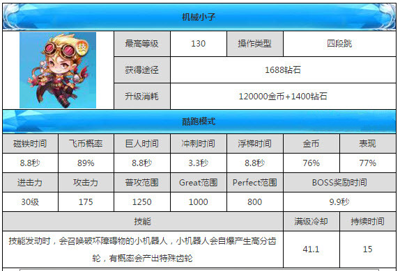 机械小子的技能看起来也并没有出彩之处。召唤破坏障碍物的小机器人,类似于魔力宝贝的黑猫。不过小机器人自曝时候产出的高分齿轮得分应该还是不低的,而且还能像飞天云豹的特殊技能一样,有特殊齿轮,估计特殊齿轮也有着类似加表现分/加盾/加磁铁效果等作用哦。这款人物是四连跳人物,估计也是无法超越猫小魅。