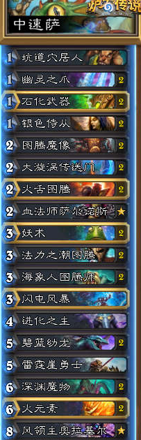 血法:血法跟这套卡组契合度很高,如果没有的话就用狗头人代替吧,2费法伤是关键,当然,如果你可以自信声控法伤图腾的话,也可以不带。