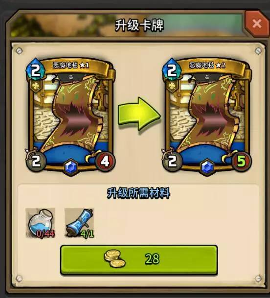 不过这里倒还可以,强化只能升星,并不是一级一级的,而且消耗的也只是粉尘和书卷(来自对战和分解卡牌)。